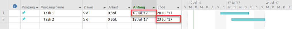 - Bei Task 2 verschiebt sich das Ende auf den 24. Juli. Das ist der nächstgelegene Arbeitstag für das Ende dieses Vorgangs.