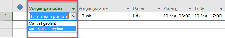 Im Falle manuell geplanter Vorgänge erscheint das Fragezeichen in der Spalte Vorgangsmodus. Das Fragezeichen erscheint nicht mehr, wenn Sie die Dauer des Vorgangs editieren oder einen Anfangs- und einen Endtermin für den Vorgang erfassen.