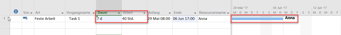 Ändern Sie die Dauer des Vorgangs, so bleibt das Arbeitsvolumen von 40 Stunden konstant. Anna erhält lediglich mehr Zeit, um dieses Arbeitsvolumen zu erledigen, nämlich 7 Tage.