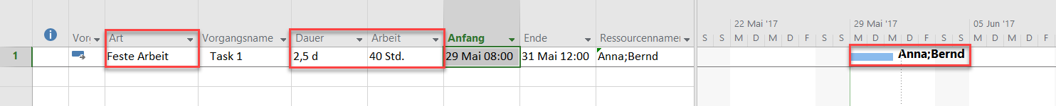 Kehren wir zur Ausgangssituation zurück und weisen Bernd als Unterstützung für Anna zu. In diesem Fall wird das Arbeitsvolumen von 40 Stunden auf zwei Ressourcen verteilt, die je eine Verfügbarkeit von 100% haben. Beide zusammen benötigen nur noch 2,5 Tage zur Erledigung des Arbeitsvolumens in Höhe von 40 Stunden.
