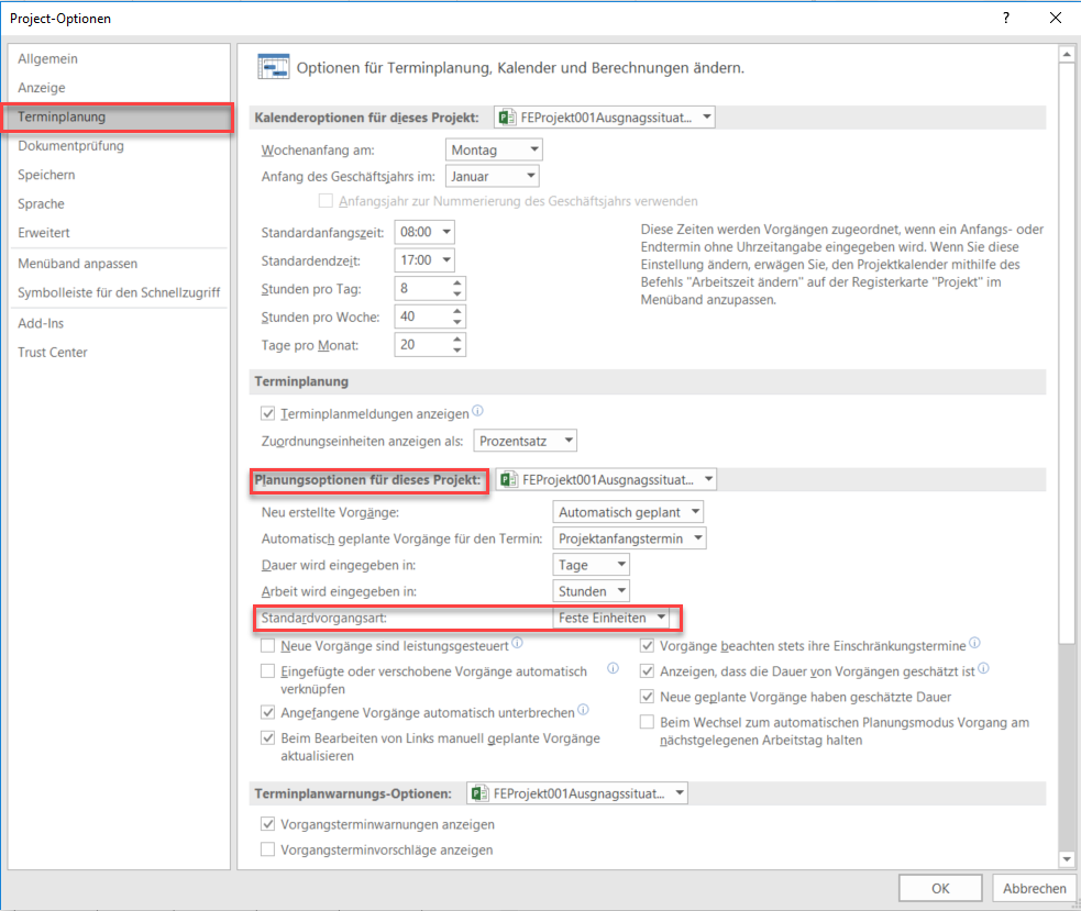 Jetzt sehen Sie die Optionen Ihres MS Project. Unter Terminplanung im Abschnitt Planungsoptionen für dieses Projekt finden Sie die eingestellte Standardvorgangsart.