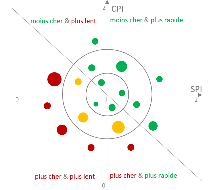 Il peut arriver qu’un CPI > 1 coïncide avec un SPI < 1 ou vice et versa. On peut aussi illustrer cela graphiquement. Le diamètre du projet individuel peut représenter les coûts prévus. Cela permet aussi d’évaluer le degré absolu de variance.