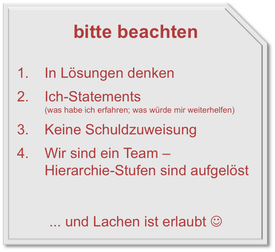 Die Moderation kann jetzt kurz die Vorgehensweise erläutern. So hat die gesamte Runde der Teilnehmenden den gleichen Kenntnisstand und Missverständnisse werden ausgeräumt.