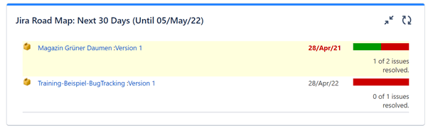 - Jira Road Map: Dieses Gadget zeigt Ihnen an, welche Versionen der Software-Projekte (im Gadget ausgewählte oder „alle Projekte“) geplant sind und wie die Arbeit an diesen Versionen voranschreitet.