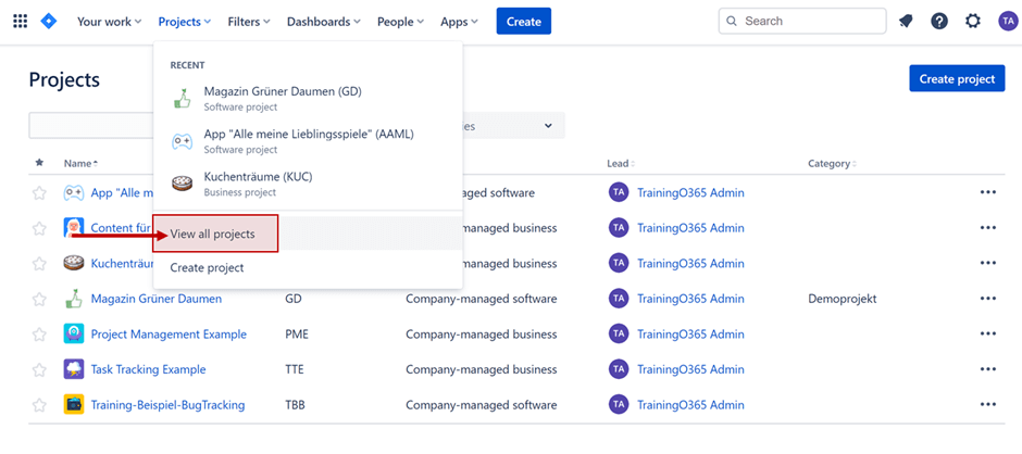 In Jira sehen Sie unter „Projects“ / „View All Projects” eine Liste aller Projekte in Ihrer Jira-Instanz, auf die Sie Zugriff haben. Diese Liste können Sie in Ihren Profileinstellungen auch als Standard-Startansicht nach dem Einloggen in Jira festlegen.