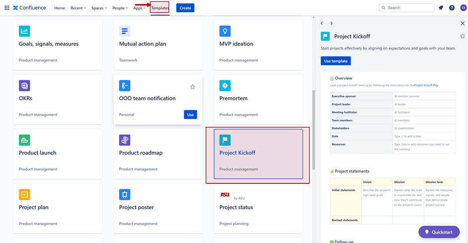 Nutzen Sie die „Project Kickoff“-Vorlage in Confluence. Alternativen sind die Templates “Project poster“, „Master project documentation“, „Project plan“ und einige weitere, die dieser ähnlich sind.
