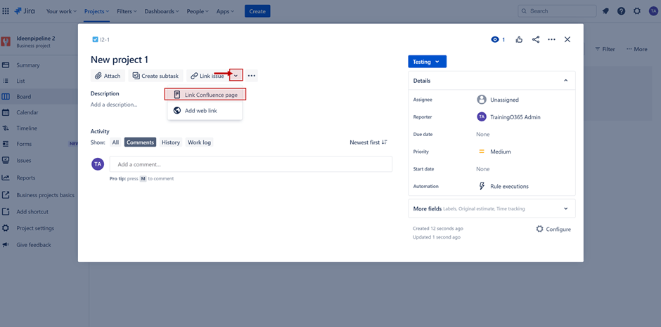 - Öffnen Sie ein Jira-Issue in Ihrer Ideenpipeline, das nun zu einem Projektantrag werden soll.