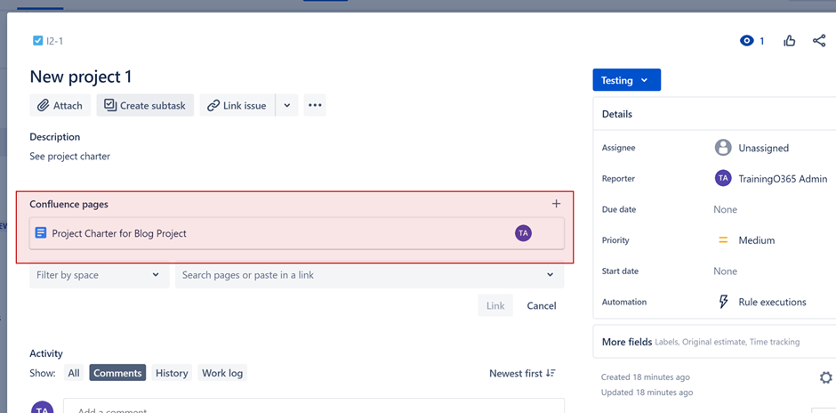 Wenn Confluence an Jira angebunden ist, können Sie in einem Issue über das Drop-Down-Symbol neben „Link Issue“ auf „Link Confluence Page“ gelangen (siehe folgenden Screenshot) …