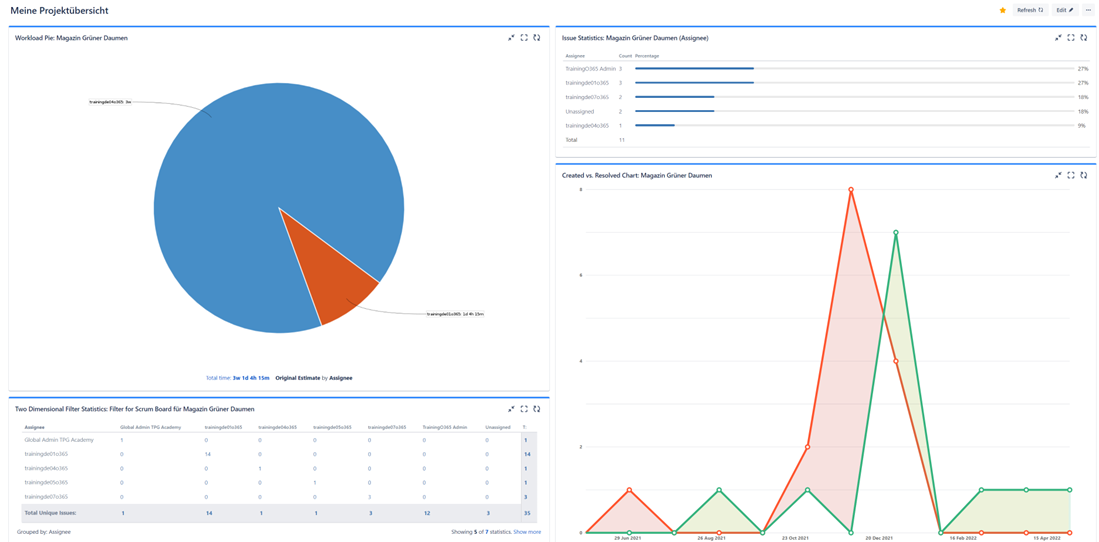Jira-Dashboards bestehen aus sogenannten „Gadgets“, die Daten in bestimmter Form darstellen (ähnlich wie in Reports), aber konfigurierbar sind. Die folgenden Dashboard-Gadgets können Ihnen dabei besonders hilfreich sein: