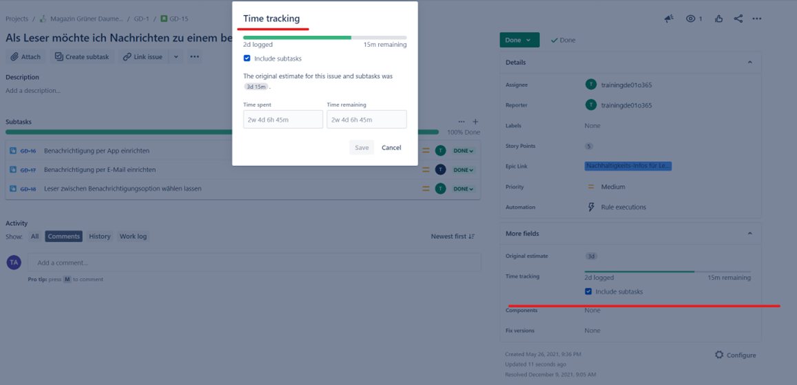 Das „Time tracking“-Feld in Jira-Issues dient zur Erfassung von Plan- und Ist-Bearbeitungszeiten. Wenn diese regelmäßig und gut gepflegt sind, lassen sich Berichte über Zeiterfassungen und Arbeitslast erstellen (siehe folgende Screenshots).