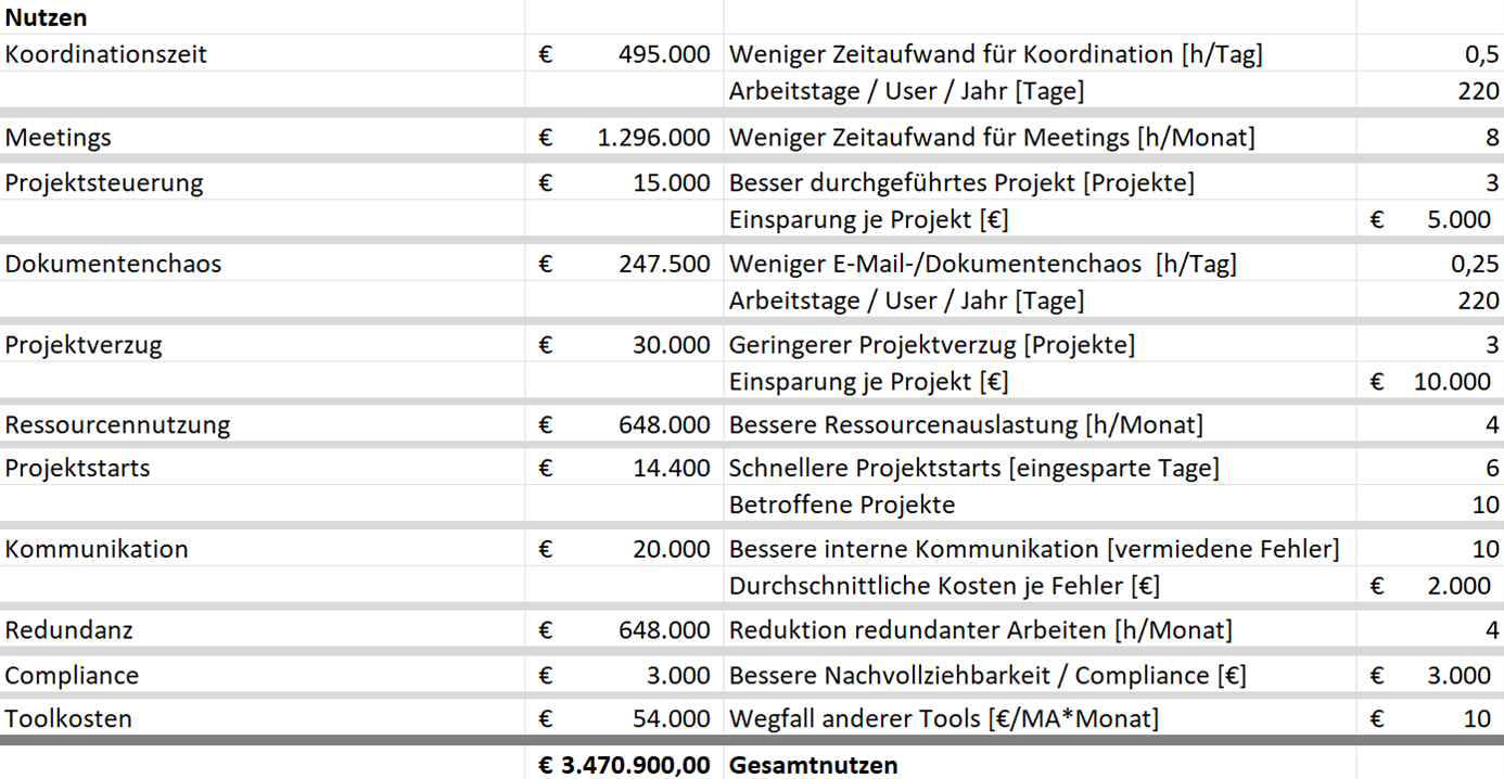 Den wirtschaftlichen Nutzen des PPM-Tools zeigt die folgende Tabelle, die verschiedene Benefits berücksichtigt: