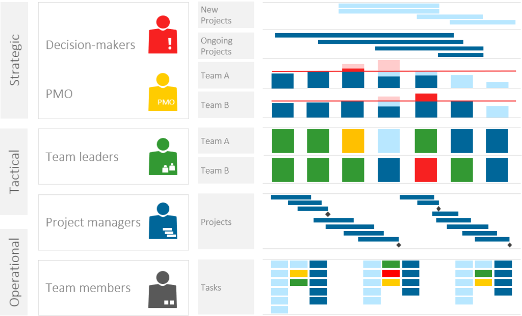 Le PMO assume de plus en plus la coordination de la gestion des ressources aux côtés des chefs d’équipe et des chefs de projet. En collaboration avec les décideurs, ce bureau central doit fournir des capacités dotées des compétences appropriées de manière proactive.