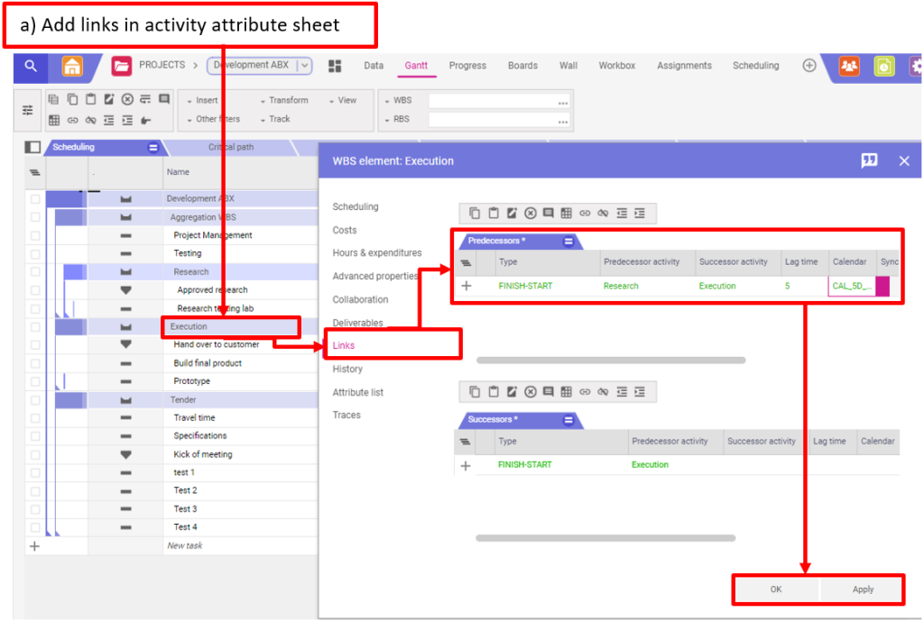 Ouvrez la fiche d’attributs de l’activité en double-cliquant sur l’activité et allez dans l’onglet Liens (links). Vous pouvez également utiliser CTRL+E pour ouvrir la fiche d’attributs ou cliquer avec le bouton droit de la souris sur Editer. Sélectionnez les activités prédécesseurs et définissez le type. Le type de lien FINISH-START est affiché comme valeur par défaut.