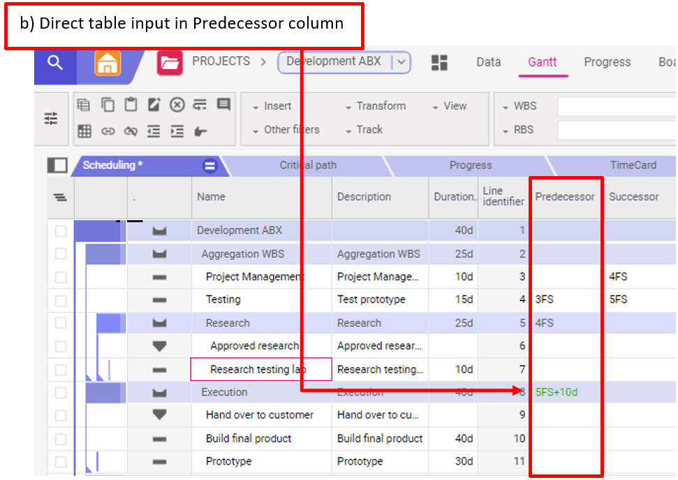 Accédez à la page Gantt, onglet Planification (Scheduling), et saisissez les relations dans la colonne Prédécesseur. Saisissez le numéro de ligne de l’opération à lier directement dans la cellule. Les types de liens autres que FINISH-START doivent être saisis par abréviation après le numéro de ligne de l’opération liée (par exemple, 4FF = FINISH-FINISH avec l’opération 4).