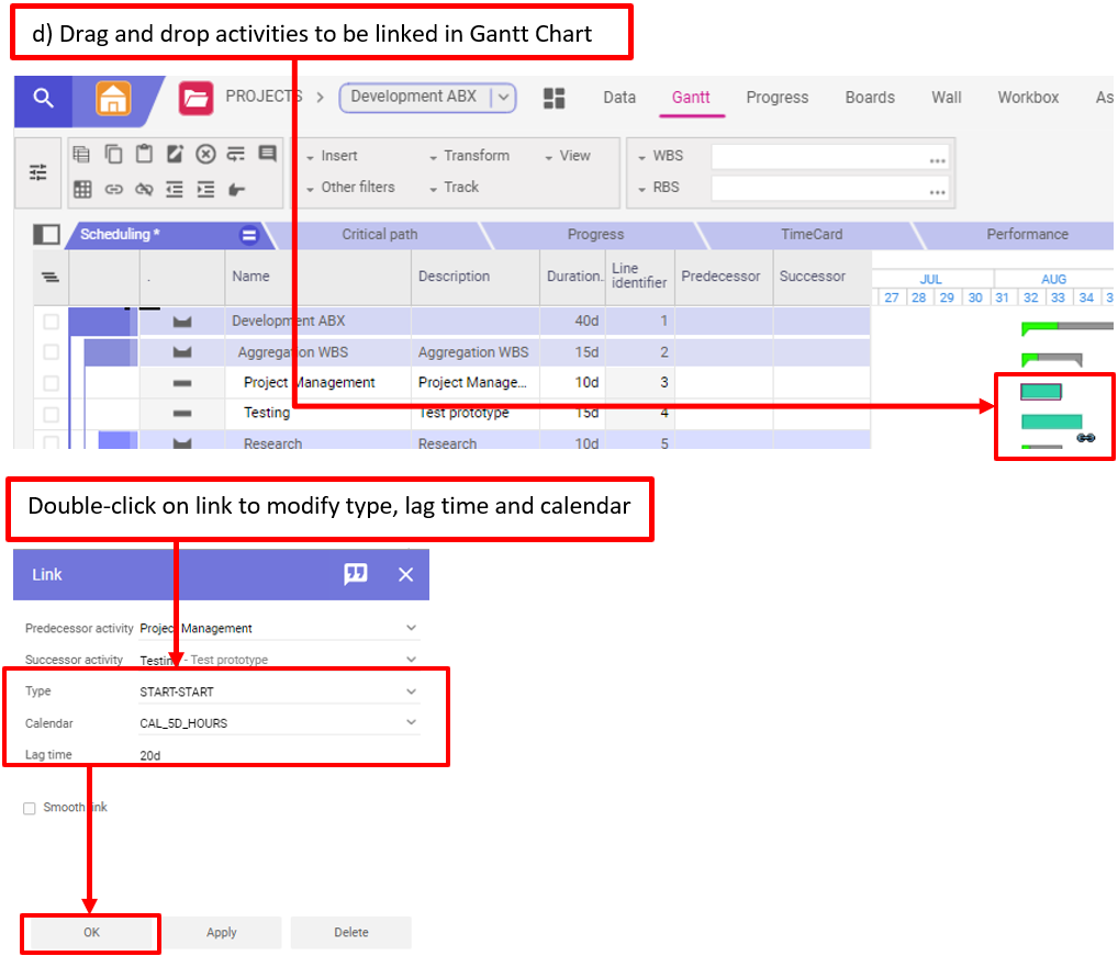 d) Glisser-déposer des activités à lier dans le diagramme de Gantt