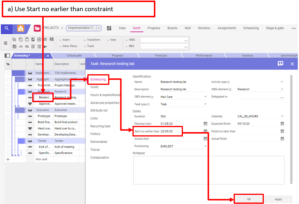 A noter : En modifiant manuellement le début planifié d’un sous-projet (WBS Element) ou d’une tâche, vous créerez automatiquement une contrainte Début au plus tôt pour cette activité.