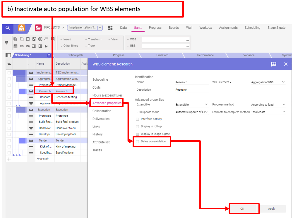 b) Désactiver la population automatique pour les sous-projet (WBS Element)