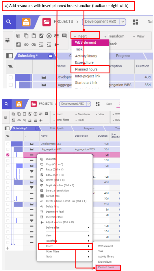 b) Si vous souhaitez insérer une nouvelle activité sous une activité existante, cochez l’activité, cliquez avec le bouton droit de la souris et sélectionnez Insérer un sous-projet (WBS element), ou Insérer une tâche (task).