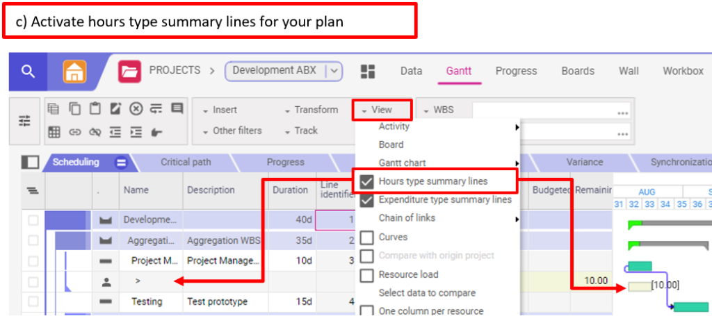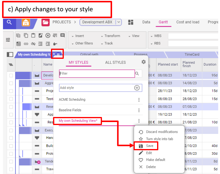 Pour visualiser les informations au niveau du projet ou du sous-project (WBS element), vous pouvez créer un style avec au moins les éléments suivants dans la page Gantt ou Données de votre projet :