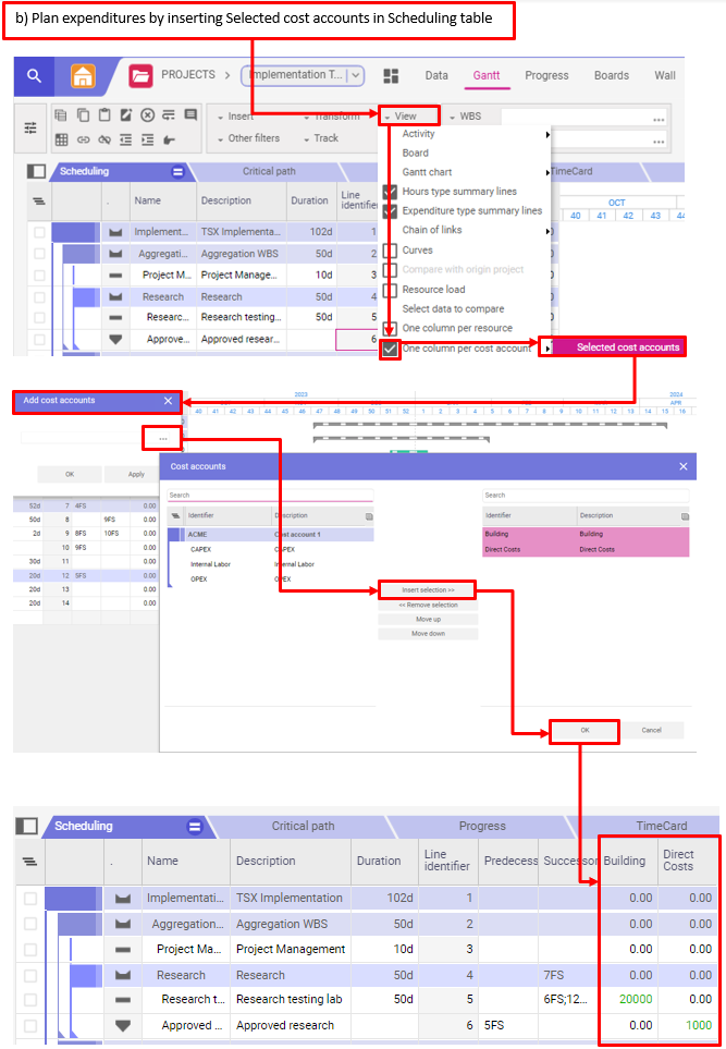 b) Planifier les dépenses en insérant les Comptes de coûts sélectionnés (Selected cost accounts) dans le tableau de planification (Scheduling)
