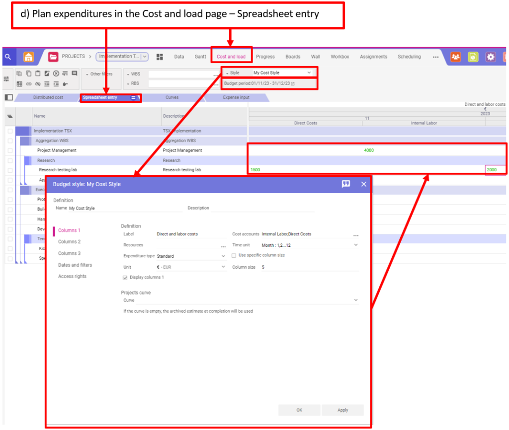 d) Prévoir les dépenses dans la page Coûts et charges (Cost and load) – Saisie sur tableur (Spreadsheet entry)