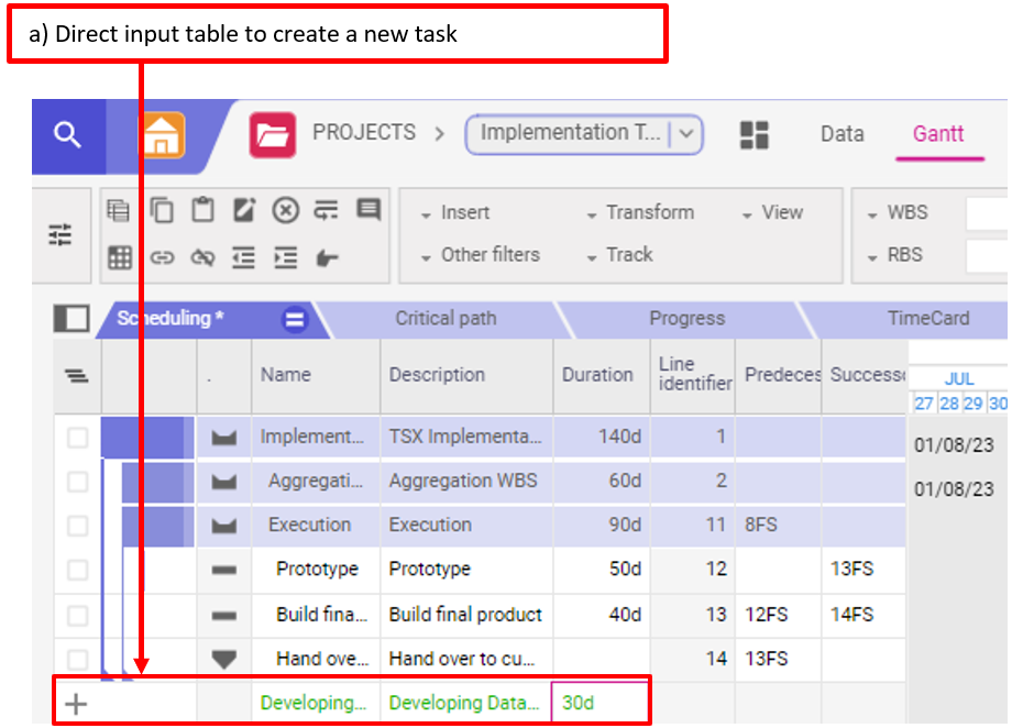 a) Le tableau de saisie directe est utile si vous souhaitez ajouter une tâche au bas de votre plan.