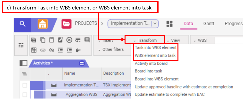 c) Un sous-projet (WBS element) peut être retransformé en tâche en cliquant sur Transformer – sous projet en tâche (Transform WBS element into task) s’il y a une activité enfant en dessous.