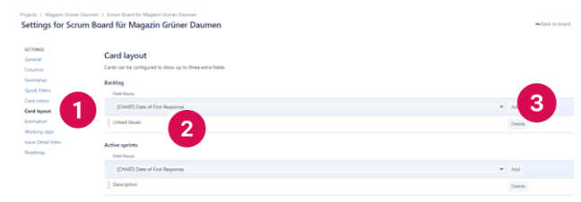 Gehen Sie dann auf Card layout (1) und fügen Sie anschließend “Linked issues” bei der Backlog-Ansicht (2) hinzu. Vergessen Sie bitte nicht, auch auf “Add” (3) zu klicken.