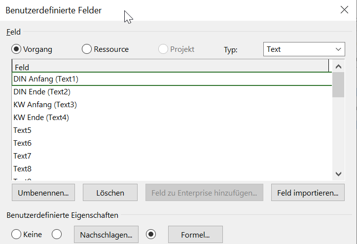 Legen Sie ein benutzerdefiniertes Feld unter „Text1“ an. Benennen Sie das Feld in „DIN Anfang (Text1)“ um.