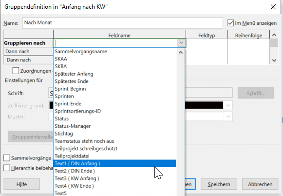Öffnen Sie danach in der Zeile „Gruppieren nach“ in „Feldname“ das Dropdown-Menü. Wählen Sie das benutzerdefinierte Feld „Text1 (DIN Anfang)“ aus.