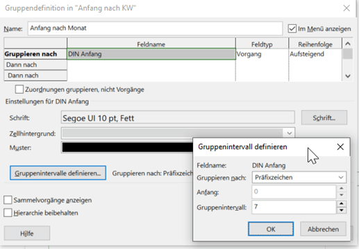 Die eigentliche Gruppierung nach „Anfang im Monat xx“ wird dadurch erreicht, dass das Gruppenintervall definiert wird. Wählen Sie hier bei „Gruppieren nach“ „Präfixzeichen“ aus und stellen Sie das Gruppenintervall auf 7. Damit wird nach dem 7. Zeichen gruppiert, nach ISO Datumsformat ist das der Monat.