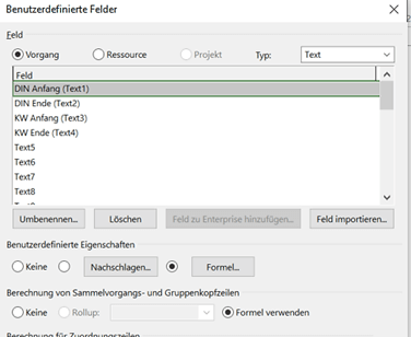 Damit das ISO Datum auch in den Gruppenzeilen angezeigt wird, muss in beiden benutzerdefinierten Feldern „DIN Anfang“ und „DIN Ende“ Formel für die Berechnung von Sammelvorgangs- und Gruppenkopfzeilen ausgewählt sein.