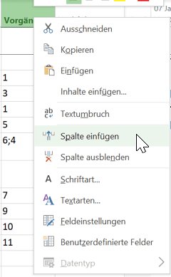Fügen Sie mit der rechten Maustaste „Spalte einfügen“ die beiden benutzerdefinierten Felder („DIN Anfang (Text 1)“ und „DIN Ende (Text 2)“) an die gewünschte Stelle in der Tabelle ein.
