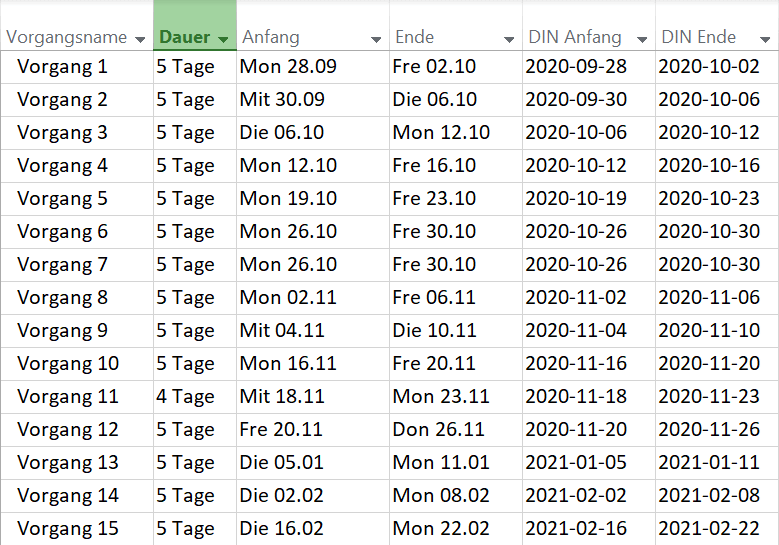 Tipp: Für eine bessere Übersicht können Sie die „Standard“-Datumswerte (Anfang, Ende) ausblenden (rechte Maustaste auf den Spaltenkopf von Ende und Anfang, dann Spalte ausblenden).