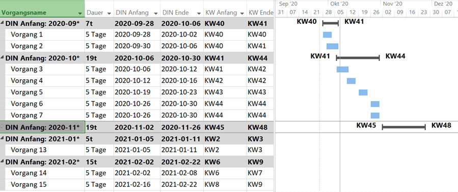 Durch die Darstellung der Datumswerte gemäß der ISO Norm lässt sich jetzt eine sehr interessante Gruppierung erstellen, die eine Darstellung der Vorgänge nach Beginn eines Monats zeigt. Die Lösung sieht dann so aus und wird anschließend beschrieben. Durch die neue Gruppierung können Sie Monate kompakt als Sammelvorgang wie „alle Vorgänge, die im November anfangen (DIN Anfang: 2020-11*)“ oder detailliert wie „alle Vorgänge mit DIN Anfang: 2020-10*“ anzeigen und drucken.