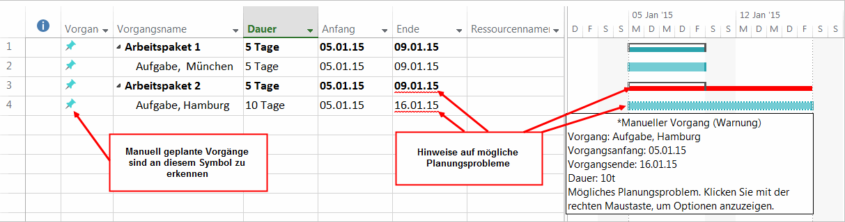 Im manuellen Planungsmodus werden – wie der Name schon sagt – Vorgänge und Sammelvorgänge manuell geplant: Anfang, Ende bzw. Dauer werden vom Projektleitenden festgelegt. Diese Angaben werden von Microsoft Project nicht geändert.