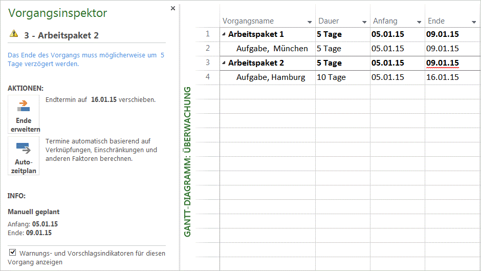 Fahren Sie mit der Maus über die angezeigten Warnhinweise in der Eingabetabelle oder im Balkendiagramm. Oder klicken Sie mit der rechten Maustaste und wählen Sie im Vorgangsinspektor beheben aus, um Lösungsvorschläge anzuzeigen.