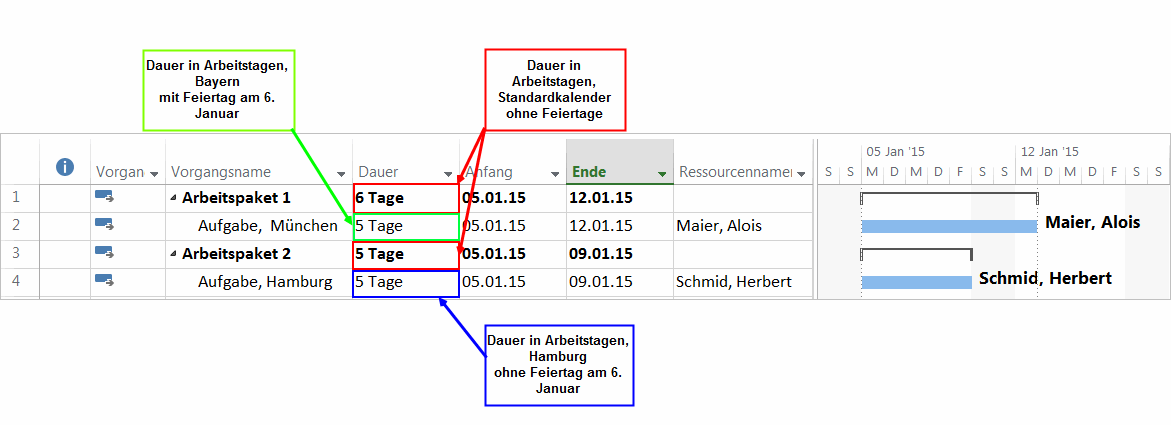 Gibt es beispielsweise mehr oder weniger arbeitsfreie Tage im Ressourcenkalender im Vergleich zu dem Projektkalender, wird die Dauer in Arbeitstage anders ausfallen.