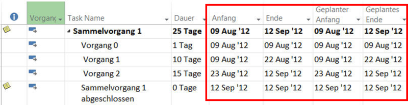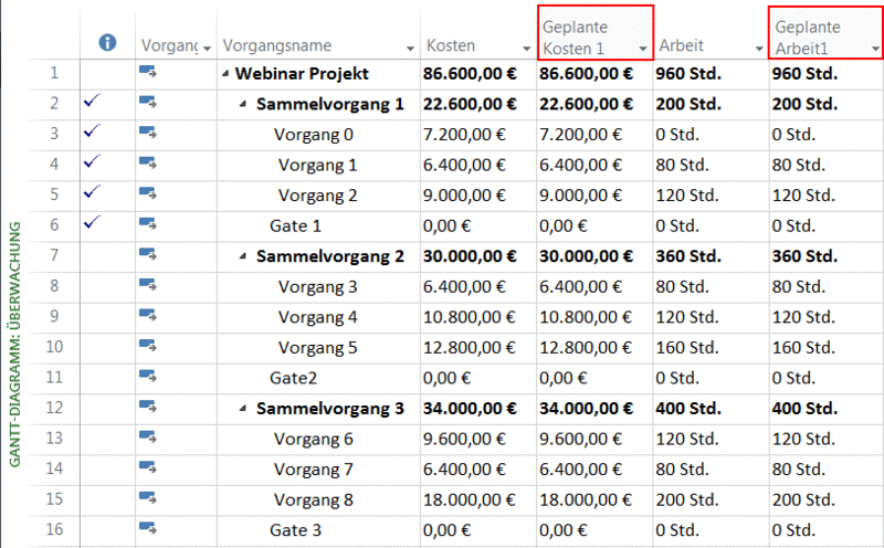Microsoft Project bezeichnet diese Werte als „geplant“. Daher finden Sie die entsprechenden Sollwerte in den Spalten Geplanter Anfang, Geplantes Ende, Geplante Dauer, Geplante Arbeit und Geplante Kosten., nachdem Sie Ihren MS Project Basisplan gespeichert haben.