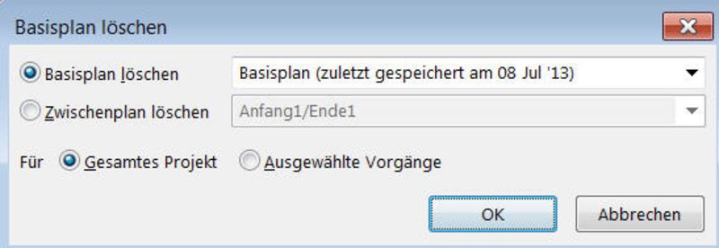 Alternativ dazu können Sie einen MS Project Basisplan löschen bzw. auch nur Teile davon. Im Falle eines gesamten Basisplans gehen Sie im Menüband auf Projekt / Basisplan festlegen / Basisplan löschen und wählen anschließend den zu löschenden Basisplan aus der Liste sowie Gesamtplan aus. Bestätigen Sie mit OK.