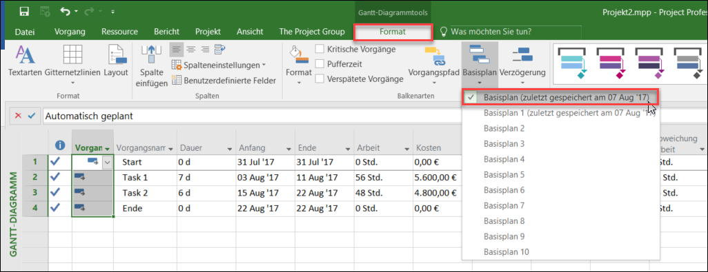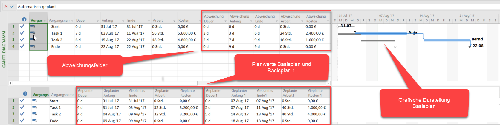 Sie können die berechneten Werte mit Basisplan 1 vergleichen, indem Sie die entsprechenden Spalten wie z.B. Kosten und Geplante Kosten 1 einblenden. Oder wählen Sie in der Ansicht Gantt-Diagramm Überwachung den Basisplan 1 (Menüband Format/Basisplan/Basisplan 1 im Menü).