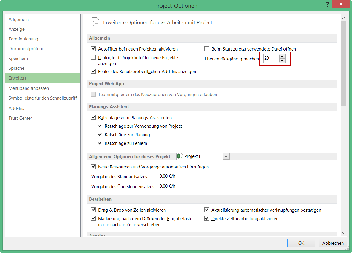 Die Anzahl der verfügbaren Schritte der Funktion Rückgängig ist konfigurierbar. Ohne Anpassung der Option stehen 20 Ebenen zur Verfügung.