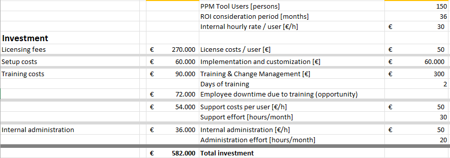 Thus, an ROI of 300% means that investment in a PPM tool creates four times the economic benefit in relation to the investment costs.