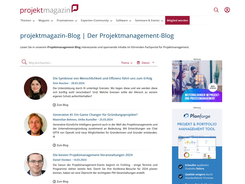 Der Blog des Projektmagazins ist ein kostenloser Bereich des ansonsten kostenpflichtigen Medienangebots. Er bietet praxisnahe Inhalte für Projektmanager:innen, Führungskräfte und alle, die in Projekten tätig sind. Der Blog deckt ein breites Spektrum an Themen ab, darunter klassische und agile Projektmanagement-Methoden sowie aktuelle Trends wie Digitalisierung und Remote Work. Die Beiträge bieten fundierte Tipps zur effektiven Planung, Steuerung und Durchführung von Projekten und beleuchten wichtige Aspekte wie Ressourcenmanagement, Zeitplanung und Risikomanagement. Darüber hinaus beschäftigt sich der Blog intensiv mit der Führung von Teams und der Entwicklung einer erfolgreichen Teamdynamik. Ergänzt wird das Angebot durch tiefgehende Fallstudien und Erfahrungsberichte, die wertvolle Einblicke in die Praxis bieten. Der Blog dient als wertvolle Ressource, um sich über die neuesten Entwicklungen und Best Practices im Projektmanagement zu informieren und weiterzubilden.