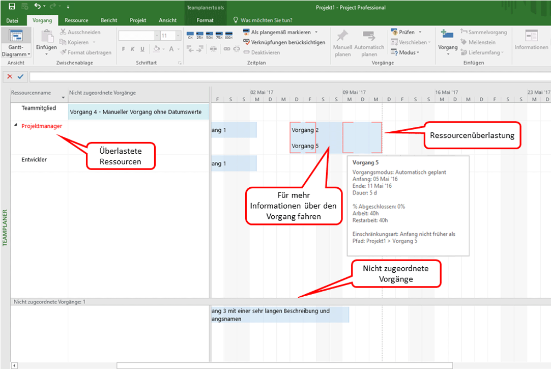 - Bei der Ressourcenplanung in MS Project Teamplaner können Sie nicht mehrere Ressourcen zu einem Vorgang zuordnen. Die Zuordnung weiterer Ressourcen muss über die GANTT-Ansicht oder die Vorgangsinformationen vorgenommen werden.