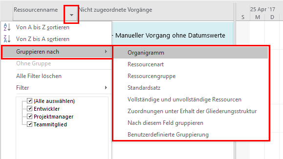 Sie können die Ressourcen auch filtern und gruppieren, indem Sie auf den Pfeil neben der Spaltenüberschrift klicken.