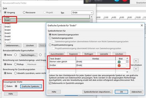 Ich habe eine Spalte mit dem geplanten Enddatum des jeweiligen Vorganges und daneben eine Spalte, in dem dann das tatsächliche Enddatum eingetragen werden soll, erstellt. Ich möchte nun, dass sich die Hintergrundfarbe der Zelle (nicht die Farbe der Balken) beim tatsächlichen Enddatum entweder in grün färben, wenn es früher oder genau an dem geplanten Datum fertig geworden ist, oder sich der Hintergrund rot färbt, wenn das geplante Fertigstellungsdatum überschritten wurde. Im Excel ist das kein Problem – im MS Project leider schon.