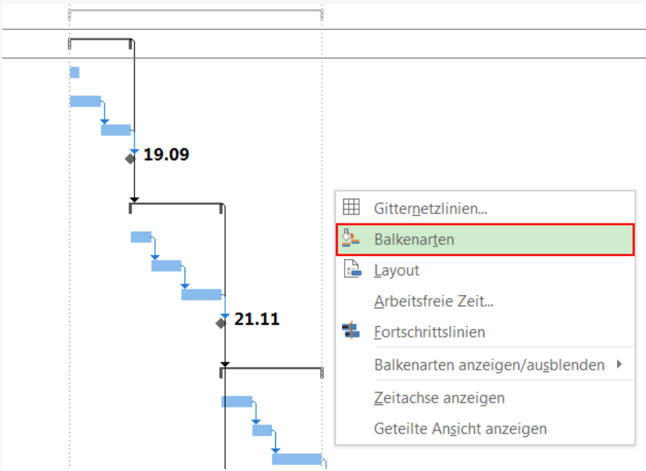 Wählen Sie zum Editieren der Balkenformate mit der rechten Maustaste Balkenarten im Kontextmenü im Bereich des Gantt Charts aus.