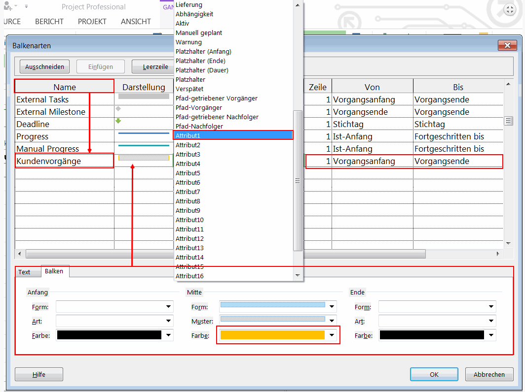 In einer leeren Zeile erstellen Sie eine zusätzliche Balkenart für jedes der definierten Vorgangsattribute („Kundenvorgänge“, „interne Vorgänge“, „externe Vorgänge“), indem Sie: