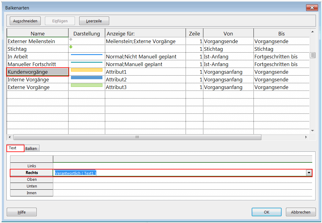 Selektieren Sie dann die jeweilige Balkenart und wählen Sie das Textfeld „Verantwortlich“ anstelle von „Ressourcenname“ aus der Dropdown-Liste des Felds Rechts und bestätigen Sie mit OK.